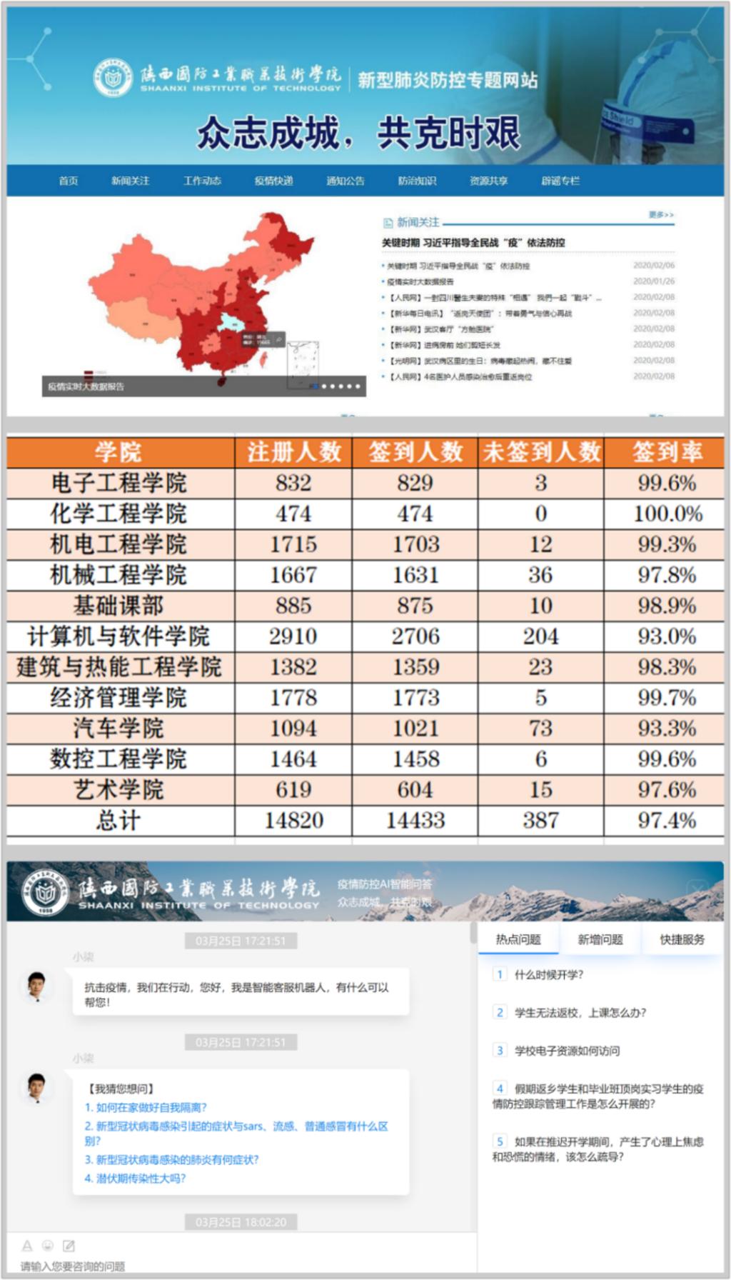学校坚持以学生为中心开展工作,积极开发了betway必威中文正版新型肺炎防控专题网站,依托易班工作站进行进一步宣传和推广,网站包含新闻关注、工作动态、疫情传递、通知公告、防疫知识、资源共享、辟谣专栏,该网站还包含疫情防控AI智能问答,依托智能互动,让师生实时掌握疫情动态,加强了师生对于疫情的认知。为精确掌握“每日健康打卡”情况,学工部开发了“每日健康打卡”系统,依托易班平台实时跟进与反馈,监督每一名学生每天定时打卡签到,从2月18日开始,累计打卡534021次,为学生返校奠定基础。易班还开发了多个疫情防控轻应用,引导学生积极参与在线活动。二级分院积极开展普及疫情防控知识、居家抗疫、积极参与志愿服务等主题网络会议,吹响疫情防控“集结号”。