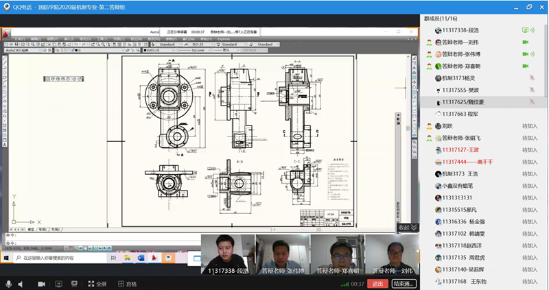 二是制定网络答辩规范与流程。为了切实保证人才培养质量,机制教研室认真制定了本次网络视频答辩规范和详细的答辩流程。本次网络视频答辩要求学生在答辩期间,确保麦克风打开、扬声器打开、电脑摄像头开启,答辩过程要求全程录音,并保留1张答辩视频截图(含所有答辩教师和答辩学生头像的答辩过程截图);设计汇报主要包括:CAD零件图、毛坯图、工艺规程、夹具图、刀具图和量具图,汇报之后是答辩教师的问答环节,并限定了汇报时间。本次网络视频答辩严格按照线下答辩的标准和流程进行,没有省略任何环节,确保了网络视频答辩的效果和质量。