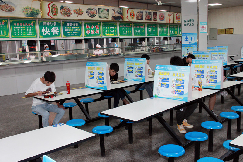 为保证学生用餐安全,学校餐厅制定了错峰就餐时间表,并在餐厅外广场上增设了临时售饭窗口,在餐厅内的餐桌上设置了分隔牌,保持用餐距离。此外,学生还可以提前加档口微信、QQ群,提前取餐,随到随取,节省用餐时间和空间。