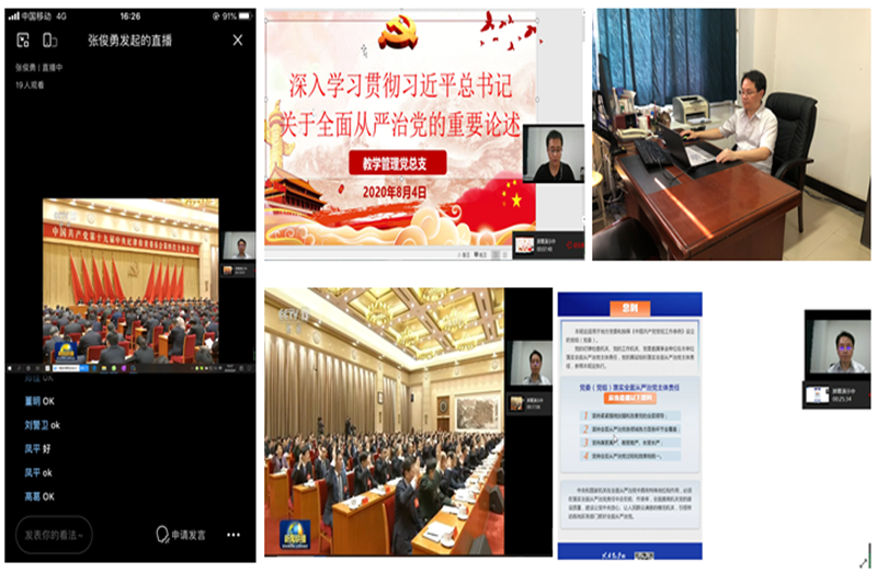 【教学管理党总支】根据学校8月份基层党组织专题学习安排,8月4日下午,教学管理党总支组织全体党员利用线上线下形式召开了深入学习贯彻习近平总书记关于全面从严治党的重要论述专题会议,会议由教学管理党总支书记张俊勇主持。第一阶段,教学管理党总支副书记吴德君领读学习了文件《习近平总书记在十九届中央纪委四次全会上的重要讲话精神》;接着,全体党员集中观看专题视频《中国共产党第十九届中央纪律检查委员会第四次全体会议公报》。第二阶段,教学管理党总支书记张俊勇带领大家学习了《党委(党组)落实全面从严治党主体责任规定》的系列图解。第三阶段,全体党员共同学习了后勤藏窝案-严查“一锅端”(西安电子科技大学院党委常委、副校长陈勇、张培营案警示)。会议最后,各位党员同志表示要深刻认识党中央关于全面从严治党战略部署的重大意义,要增强政治定力,坚定信心决心,忠诚履职尽责,要以坚强的政治定力和勇气推动正风肃纪反腐,把讲政治的各项要求落实到思想、工作、生活的方方面面,为推动学校全面从严治党向纵深发展做出自己的贡献。