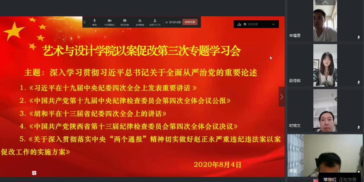 【艺术学院党总支】根据学校党委《以案促改专题学习教育工作安排》通知要求,2020年8月4日下午3点,艺术与设计学院党总支通过网络视频会议形式组织全体师生党员围绕“深入学习贯彻习近平总书记关于全面从严治党的重要论述”主题集中开展了“以案促改”第三次专题学习会暨征求意见建议座谈会。会议由艺术与设计学院党总支书记常继红主持。党总支组织委员王志刚带领大家学习了《胡和平在十三届省纪委四次全会上的讲话》和《中国共产党陕西省第十三届纪律检查委员会第四次全体会议决议》。他指出,我们要紧密团结在以习近平同志为核心的党中央周围,要不断攻坚克难、奋力进取,为学院的发展添砖加瓦。专题学习会结束后,分院召开了征求意见建议座谈会。大家对艺术与设计学院的领导班子在贯彻落实党中央要求、选人用人、干部队伍“转作风”和管党治党责任落实情况四个方面的工作表示了认可和赞许。在学院和自身的发展方面,参会教师各抒己见,踊跃发言,提出了很多建设性意见和建议。最后,党总支书记常继红和分院院长管阳对各位老师的建言献策表示感谢,同时希望大家今后能够继续提出建设性意见和建议,推动艺术与设计学院的发展迈向新的台阶。
