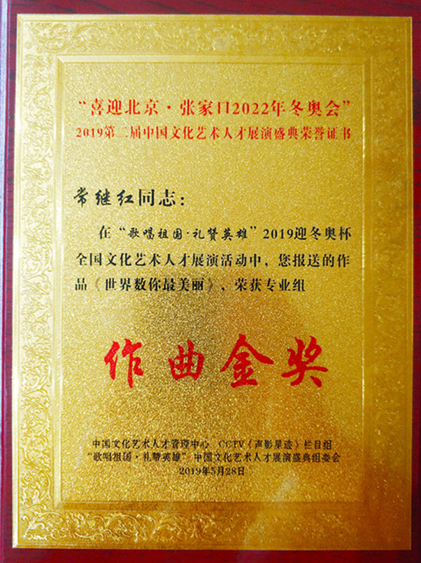 “歌唱祖国·礼赞英雄”喜迎北京张家口2022冬奥会全国大型艺术人才选拔活动于2019年3月在北京启动。我校艺术与设计学院教师常继红原创音乐作品《世界数你最美丽》参加了此次展演比赛活动,荣获专业组“作曲金奖”,并在音乐专刊《北方音乐》刊发,产生了较好的社会影响。受疫情影响,该奖项的奖牌于近日才颁发。