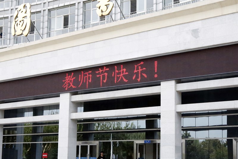 9月8日,学校点亮了图书馆LED大屏,打出“老师,您好!”“教师节快乐!”“老师,您辛苦了!”“立德树人奋进担当,教育脱贫托举希望”的标语,同时在校园内的两个大电子屏上滚动播放感恩教师的视频。