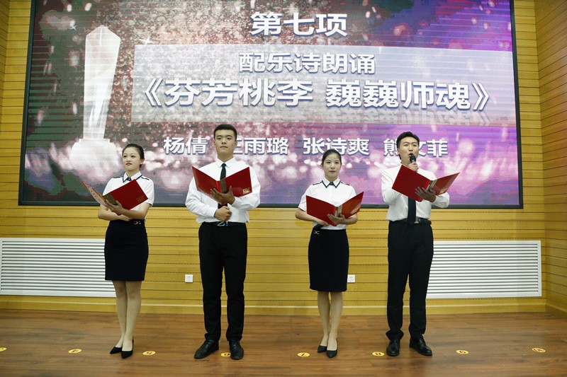 学生代表表演配乐诗朗诵《芬芳桃李 巍巍师魂》送给所有教师,表演声情并茂,令人感动。