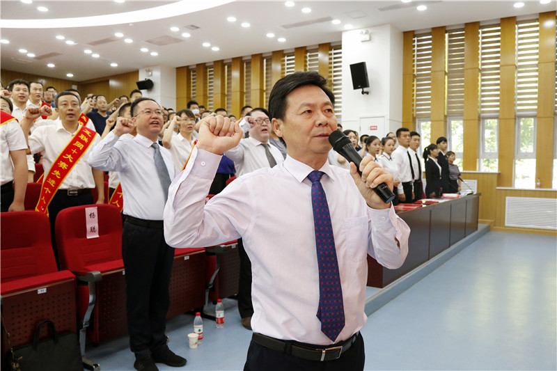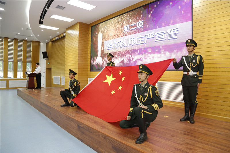 全体教师向国旗庄严宣誓,党委书记张卫平领誓。