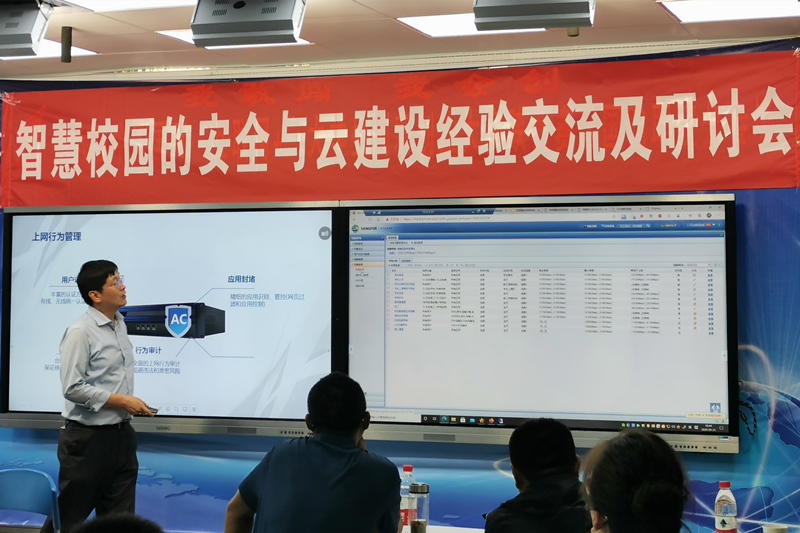 随后,与会人员参观了我校国防展馆,以及网络中心机房。与会人员在网络中心进行了网络安全经验分享交流。首先,徐华宇老师介绍学校的网络安全建设情况和信息化建设成果,从设备的功能,到平常工作的使用方式,以及师生给带来的价值,徐老师用多年的工作经验向所有讲师讲述了学校多年的建设成果,也向老师们分享了很多新的、好的产品及方案,多位老师现场提出问题共同探讨,交流十分深入。探讨结束,深信服云计算专家和安全专家进行分享,两位就当前高职的现状以及未来的建设趋势发表了各自的一些行业见解。