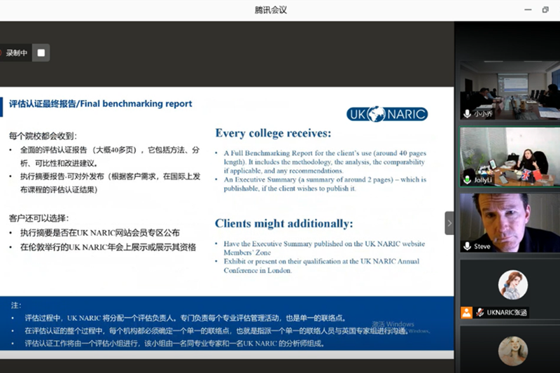 10月23日下午,我校在招就会议室通过国际远程视频直播召开高等职业教育领域国际专业标准评估认证计划说明会。UK NARIC(英国国家学历学位评估认证中心)中国首席代表李华杰、UK NARIC 评估认证专家史蒂夫·米勒、UK NARIC 中国区业务拓展部专员刘鑫受邀参加线上会议。学校副院长孟繁增出席会议,国际交流处、教务处、智能制造学院等相关负责人参加了会议。会议由国际交流处处长胥航军主持。