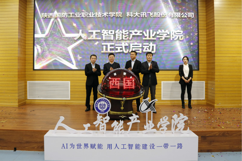 学校党委书记张卫平、校长刘敏涵、科大讯飞副总裁彭小露和陕西大区总经理彭梦明共同上台按下启动球,随着启动球的点亮,人工智能产业学院大幕缓慢拉开,标志着全国首家人工智能现代产业学院正式全面启动,全方位合作、多维度融合,诚心携手、同向发力、共谱华章,协同打造全国人工智能产业高端复合型技术技能人才培养的新高地!