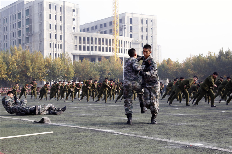 分列式后,进行军训科目汇报表演。新生带来了标兵擒敌拳表演、持枪方阵表演、战术表演等,整齐的队伍、嘹亮的口号、严整的军容、过硬的作风、精彩的展示,赢得了会场全体师生阵阵掌声。