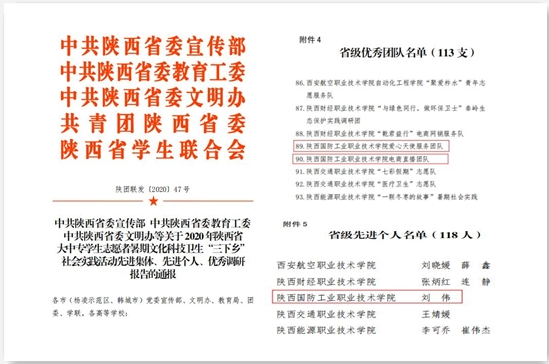 根据省委宣传部、省委教育工委、团省委、省文明办、省学联联合下发《关于开展2020年陕西省大中专学生志愿者暑期文化科技卫生“三下乡”社会实践活动的通知》精神要求,校团委积极组织开展了我校2020年暑期大学生“三下乡”社会实践活动,我校爱心天使服务团队和电商直播团队荣获2020年暑期“三下乡”社会实践活动省级“优秀团队”、刘伟老师荣获2020年暑期“三下乡”社会实践活动省级“先进个人”。