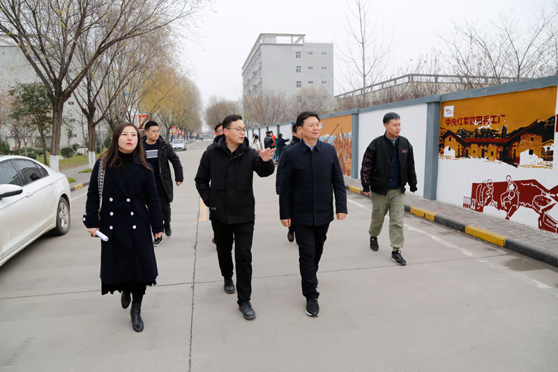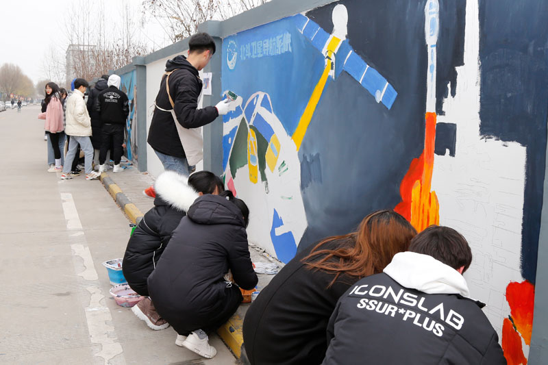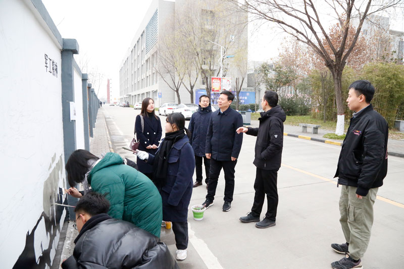 期间,校党委书记张卫平对该项目进行了实地考察。听取了艺术与设计学院院长管阳关于手绘千米“红色军工”文化长廊的设计构思、思想内涵、宣传理念、进度安排等方面的介绍,围绕军工文化元素与“双带头人”教师党支部书记惠晓钟教授进行深入的探讨,张书记指出以墙体手绘方式宣传军工、国防文化给我校大学生一种身临其境、润物无声的思想教育带入感,是一种非常新颖、优秀的教育方式。交谈中,张书记嘱咐师生们在绘画的同时要注意保暖。通过考察,张书记对艺术与设计学院深入推进“双带头人”教师党支部书记工作室建设工作给予充分的肯定,对师生们不畏严寒、持笔创作的精神予以赞扬。