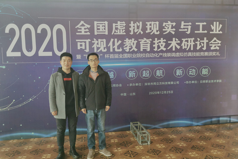 12月25日-27日,2020全国虚拟现实与工业可视化教育技术研究研讨会暨“同立方杯”首届全国职业院校自动化产线装调虚拟仿真技能竞赛颁奖典礼礼在山东日照召开,我校人工智能学院韩征、张海潮两位老师参加本次会议并代表学校领奖。本次比赛我校共获得全国一等奖2项,二等奖1项的好成绩,韩征老师获得“优秀指导老师”荣誉。