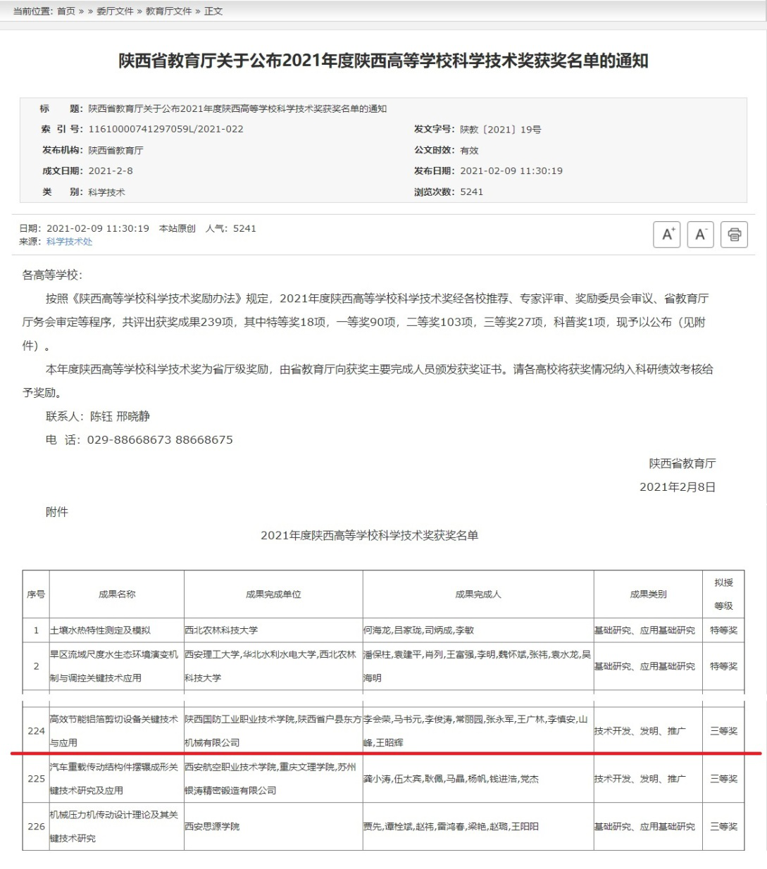 近日,陕西省教育厅发布了《陕西省教育厅关于公布2021年度陕西高等学校科学技术奖获奖名单的通知》(陕教〔2021〕19号)。按照《陕西高等学校科学技术奖励办法》规定,2021年度陕西高等学校科学技术奖经各校推荐、专家评审、奖励委员会审议、省教育厅厅务会审定等程序,共评出获奖成果239项,其中特等奖18项,一等奖90项,二等奖103项,三等奖27项,科普奖1项。