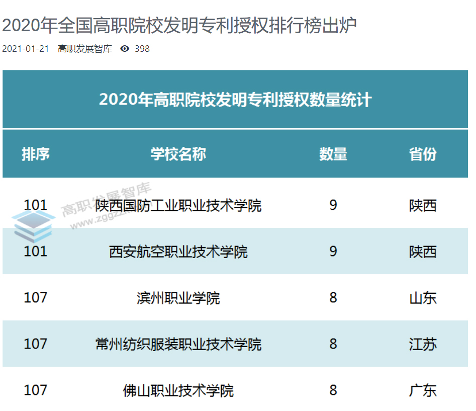 近日,“高职发展智库”发布了“2020年全国高职院校发明专利授权排行榜”,我校2020年共获得国家发明专利授权9件,位居陕西高职第一(与西安航空职业技术学院并列)。