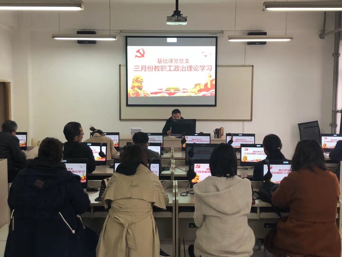 【基础课党总支】为进一步加强基础教职工政治理论学习,切实提高教职工政治素质和理论水平,根据陕国职党宣〔2021〕3号《关于2021年3月份教职工政治理论学习安排的通知》文件要求,基础课党总支于2021年3月6日在北配楼5-607会议室组织开展3月份教职工政治理论学习。基础课党总支书记权华带领全体教职工共同学习了习近平总书记在全国脱贫攻坚总结表彰大会上的讲话精神;习近平总书记在党史学习教育动员大会上的重要讲话;陕西教育系统疫情防控和2021年春季开学工作视频会议精神;《习近平总书记教育重要论述讲义》第三、四讲。全体人员共同观看了纪录片《党史故事100讲》。最后权华向全体教职工宣读陕国职党宣〔2021〕2号《关于开展“全民十四运 健康陕西在行动”标语口号和短视频征集活动的通知》和《关于做好2021年春季开学返校相关工作的通知》,要求全体教职工按照文件要求,做好开学初备课准备工作,积极热情的投入到新学期的教育教学工作中去。