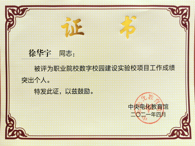 2021年4月8日,由中央电化教育馆主办、南京信息职业技术学院承办的“推广落实《职业院校数字校园规范》暨职业院校数字校园建设实验校项目总结会”在南京召开。教育部职业教育与成人教育司、中央电化教育馆有关负责同志出席了会议,来自全国260余所职业院校,部分省(自治区、直辖市)教育厅高等教育处、职业教育与成人教育处和省级电教馆(中心)的有关负责同志共400余名代表参加了会议。我校网络中心主任徐华宇老师参加了本次会议,荣获“职业院校数字校园实验校工作成绩突出个人”称号。