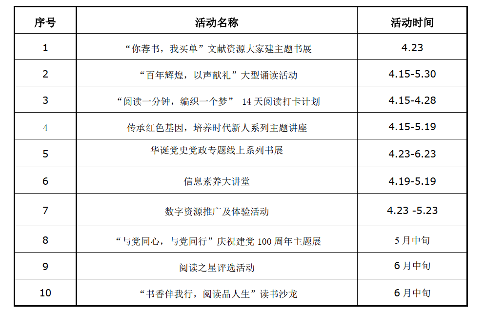 本次读书月活动面向全校师生,围绕建党100周年、资源建设、阅读推广、电子资源推广、信息素养教育以及服务教学和科研等主题,将陆续举办 “你选书,我买单”线上大型图书荐购活动、“百年辉煌,以声献礼”大型诵读活动、“阅读一分钟,编织一个梦”14天阅读打卡计划、传承红色基因,培养时代新人系列主题讲座、华诞党史党政专题线上系列书展、信息素养大讲堂、数字资源推广及体验活动、“与党同心,与党同行”庆祝建党100周年主题展、阅读之星评选活动以及“书香伴我行,阅读品人生”读书沙龙等10项活动。