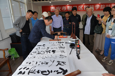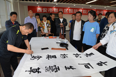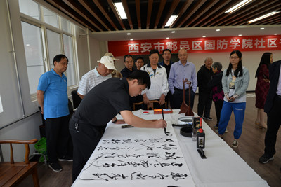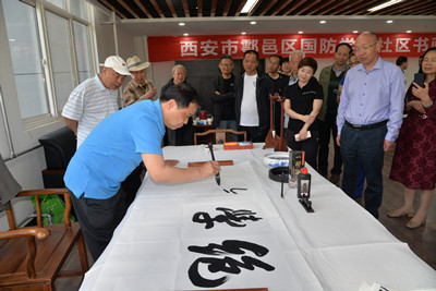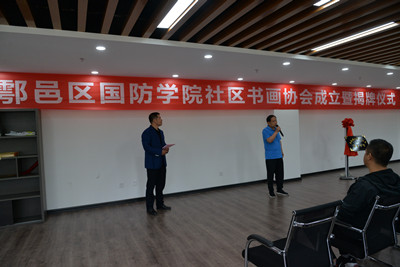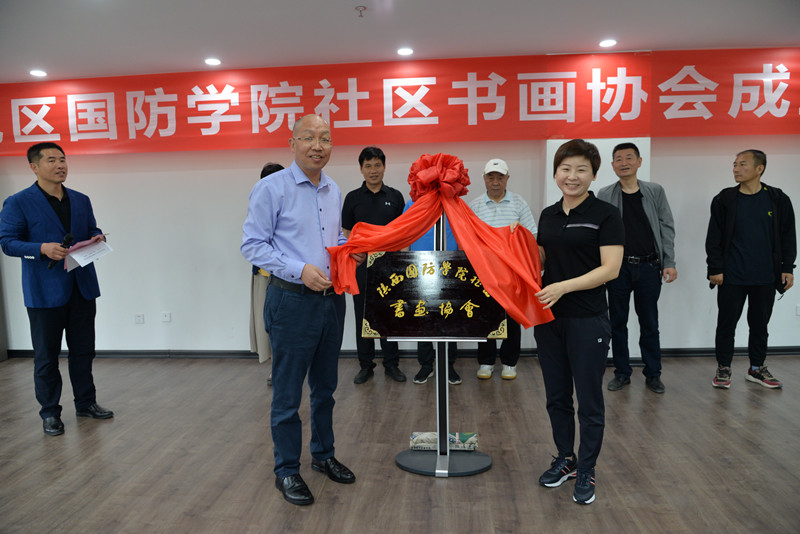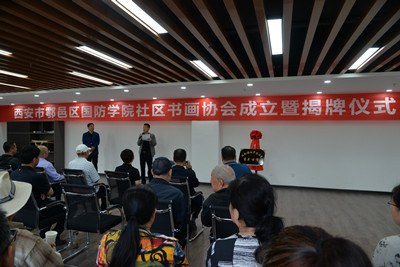 会上,余下街道副主任杨静妮宣读了《西安市鄠邑区余下街道陕西国防学院社区关于成立“国防书画协会”的决定》,并对社区书画协会的成立表示祝贺。随后,在所有与会人员热切的期待下,刘少阳和杨静妮为社区书画协会隆重揭牌。