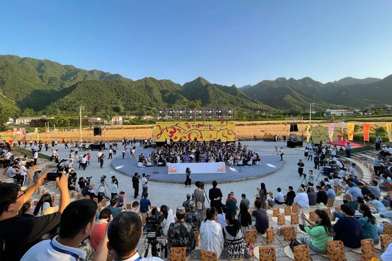 活动以终南山为背景,以麦田为支撑,在田地中搭建了一座剧场,完美呈现艺术+自然+乡村融合的文化场所。伴随着西安音乐学院带来的民族管弦乐音乐会《戏彩长安》“终南乐夜”的专场演出,美妙的音乐走入乡村,艺术融入麦田,奏响了乡村振兴的鄠邑乐章。