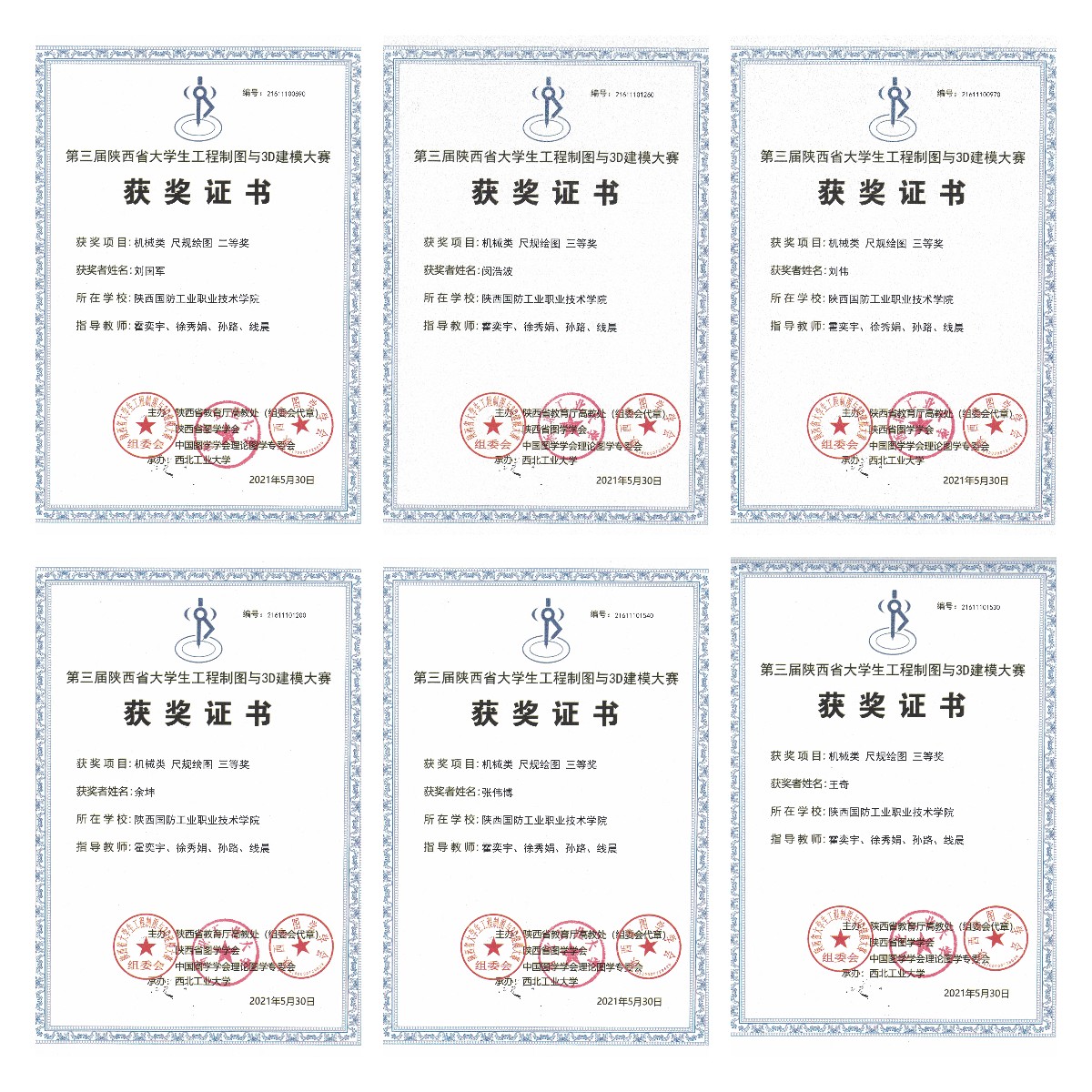 5月28日至30日,第三届陕西省大学生工程制图及3D建模大赛在在西北工业大学成功举办。经过激烈角逐,我校机械工程学院机设3196班刘国军获得尺规绘图个人赛二等奖1项;机设3195班余坤、机设3207班张伟博等5名同学获得尺规绘图个人赛三等奖5项。