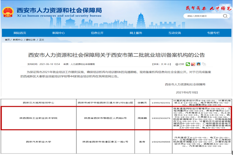 6月18日,西安市人力资源和社会保障局发布《西安市人力资源和社会保障局关于西安市第二批就业培训备案机构的公告》,我校成功获批就业培训机构,是省内第一批获批此项目的“双高院校”,将面向西安市各类就业群体开展信息通信网络运行管理员、工程测量员、养老护理员等14个工种的就业培训。