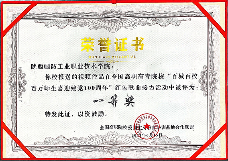 2021年6月19日,由全国高职高专院校思想政治理论课建设联盟主办,全国高职院校爱国主义教育培训基地合作联盟协办,延安职业技术学院承办的全国高职院校“喜庆建党百年”百名名师讲党史总结大会暨百城百校红歌接力活动闭幕式,在延安职业技术学院大学生活动中心隆重举行。我校报送的红歌传唱作品《建党百年》经过层层选拔,从全国近百所高职院校中脱颖而出,最终荣获一等奖。