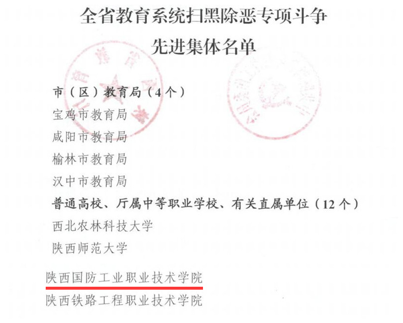 近日,中共陕西省委教育工委、陕西省教育厅发布《关于全省教育系统扫黑除恶专项斗争先进集体和先进工作者的通报》,决定对全省教育系统扫黑除恶专项斗争中表现突出的16个先进集体和29名先进工作者予以通报表扬,我校被评为“全省教育系统扫黑除恶专项斗争先进集体”。