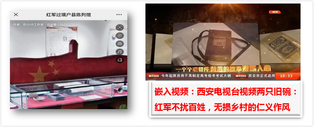 在拍摄及整理资料过程中,实践团队深入挖掘红色遗址背后的革命先辈历史故事,链接相应音频、视频,并积极通过微信、抖音等进一步推广。如在制作鄠邑区红军过境馆全景时,搜集到西安电视台制作的“两只旧碗”故事,将其链接入两只旧碗全景,进一步扩充红色场馆内容,提升观看体验。