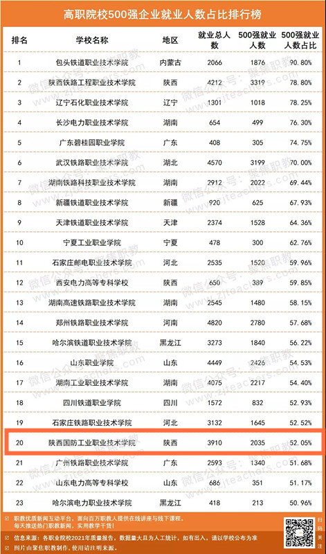 近日,聚焦职教(ID:zjteachers)收集整理了900多所职业院校就业总人数与500强企业就业人数的数据,并对数据进行统计,得出了高职院校500强企业就业人数占比排行榜。其中包头铁道职业技术学院一骑绝尘,位居榜首,占比90.8%。也是唯一一所占比超过90%的院校。陕西省有3所院校占比在50%以上,分别是陕西铁路工程职业技术学院、西安电力高等专科学校、betway必威中文正版。betway必威中文正版占比52.05%,位居第20。在化工技术类院校中,我校排名第三。