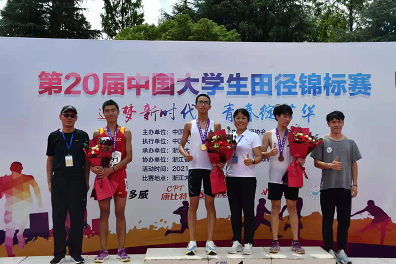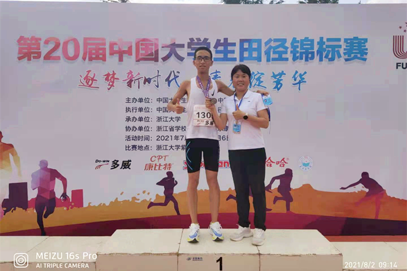 我校田径队员周航同学,在王茂利老师任领队,文英老师担任教练和现场指导下,分别于8月2日和4日参加了男子乙组5000米、10000米预决赛,周航同学在比赛场上不畏强手、奋力拼搏,最终5000米以16分29秒03荣获铜牌;10000米以35分06秒26斩获金牌。这两项均已打破陕西省大学生田径运动会省记录,同时创造我校在参加中国大学生田径锦标赛的历史最好成绩。