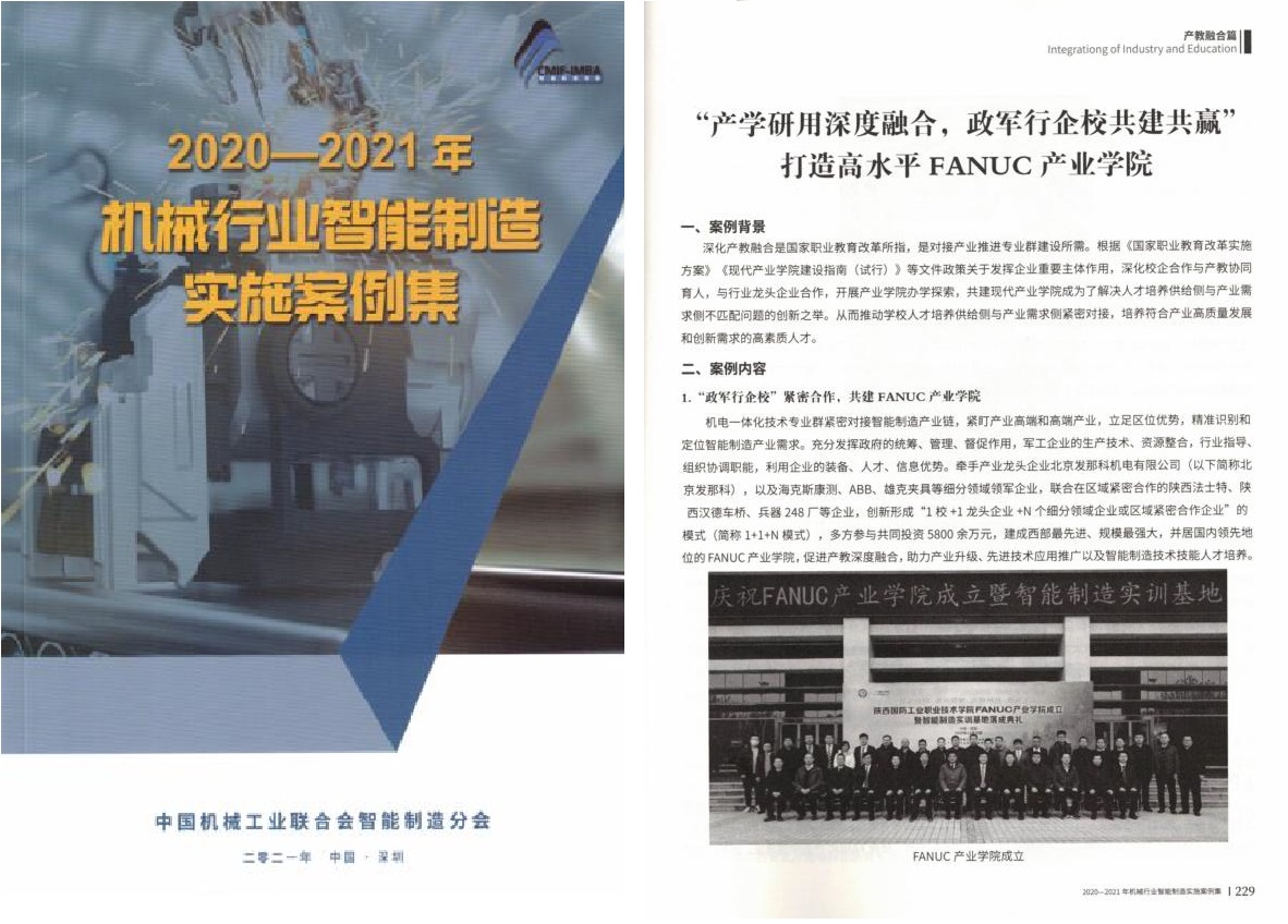 会上,在中国机械工业联合会组织的2020-2021年度机械行业智能制造实施案例评选中,由我校李俊涛、张晨亮、党威武、潘文宏组成的案例团队撰写的“‘产学研用深度融合,政军行企校共建共赢’ 打造高水平FANUC产业学院”案例从全国各级各类单位和高校报送的案例中脱颖而出,通过专家评审成功入选《机械行业智能制造实施案例集(2020-2021年)》。该案例在众多产教融合案例中,成为产教融合篇章中唯一一篇入选的典型实施案例。