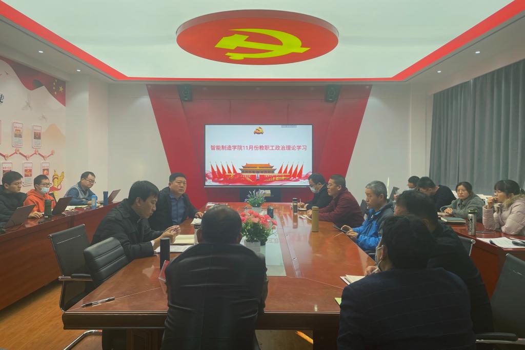 【智能制造学院党总支】为进一步加强教职工政治理论学习,切实提高教职工政治素质和理论水平,11月9日下午,智能制造学院于10楼305组织召开了11月份全体教职工政治理论学习会议,分院党政领导以及全体教职工参加了会议。会议由学院党总支副书记李俊涛主持。会上,李俊涛同志带领大家集中学习了《习近平总书记在中央人才工作会议上重要讲话》,以及《求是》杂志发表习近平总书记重要文章《用好红色资源、赓续红色血脉,努力创造无愧于历史和人民的新业绩》,观看了“德润三秦”家风建设的学习视频,带领大家学习了《改革开放简史》,阐述了中国改革开放40多年的壮阔历史。会后要求大家自学理论读物《新征程面对面》,观看建党百年献礼剧《功勋》。最后,李俊涛同志强调全体教职人员应将本次政治理论学习与自己的工作实践有机结合,尤其是总书记的重要讲话精神,奋发有为履职尽责、践行初心使命,把学习成果转化为政治能力,转化为推动工作的动力,紧扣学校事业发展核心,更好地服务学校和广大师生。