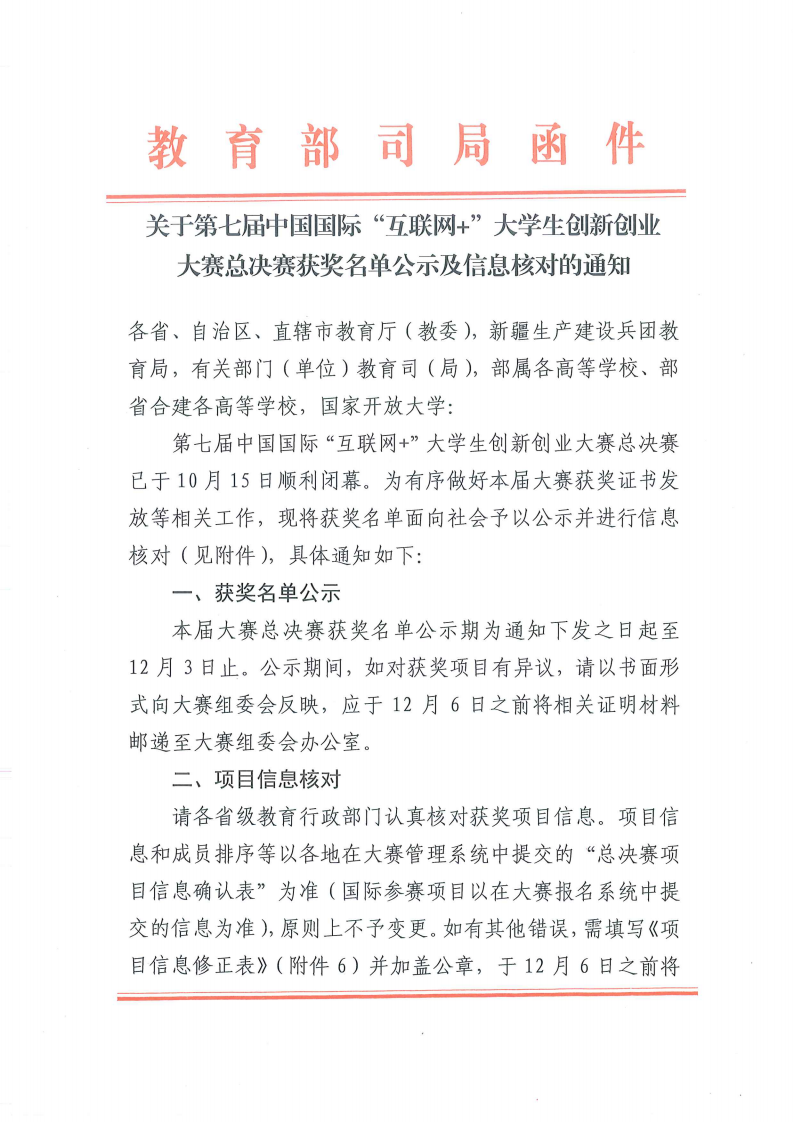 11月29日教育部对第七届中国国际“互联网+”大学生创新创业大赛总决赛获奖名单进行了公示。我校荣获职教赛道银奖1项、铜奖2项。这是自“互联网+”大学生创新创业大赛举办七届以来我校取得的最好成绩,实现历史性突破。