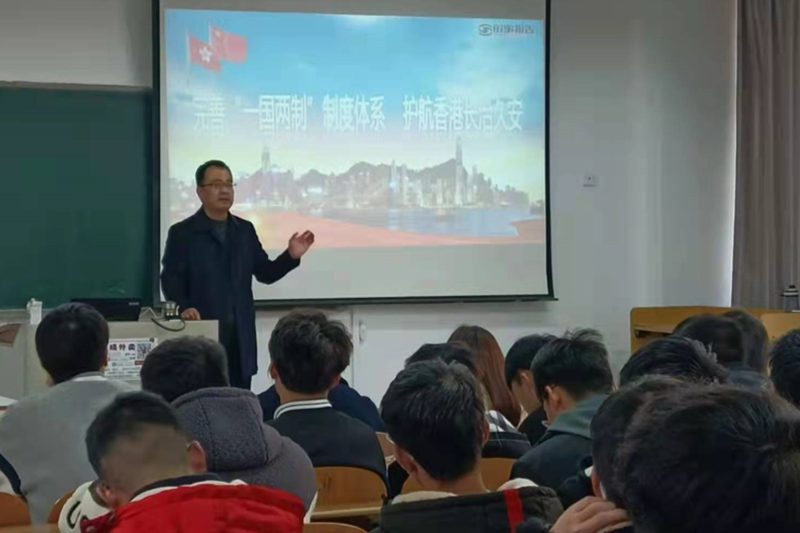校长刘敏涵,分别以“完善‘一国两制’制度体系 护航香港长治久安”“共同构建人与自然生命共同体”为题,为电子信息学院学生讲授了形势与政策课,他以香港的历史及回归来的发展变迁引入,从“国安法施行,香港实现‘由乱及治’完善选举制度,确保‘爱国者治港’坚定制度自信,完善‘一国两制’”三个维度,系统讲授了完善“一国两制”对于香港繁荣稳定发展的重要性,引导学生们对香港国安法、“爱国者治港”重要原则进行深刻理解和认识。