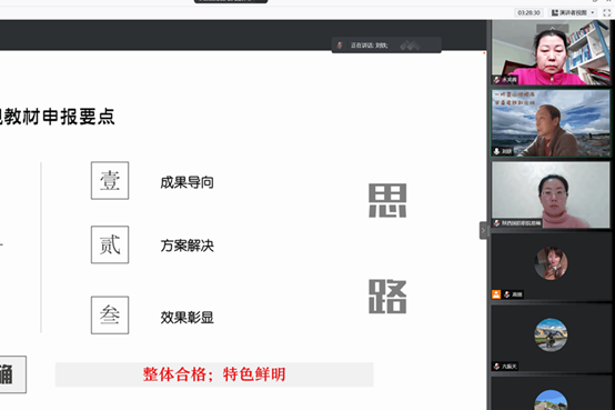 王艳丽副总编精准对标申报书内容就“国规教材申报材料填报参考”做专题报告,刘铁副总编辑从四个视角就“国规教材申报思路与要点”做专题报告。