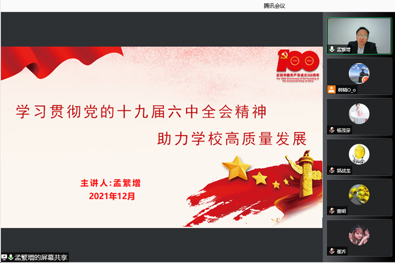为了深入学习贯彻党的十九届六中全会精神,提高党员履职能力,开创工作新局面,12月23日下午,副校长孟繁增以《学习贯彻党的十九届六中全会精神,助力学校高质量发展》为题,利用腾讯会议平台为教学管理党总支全体党员讲授专题党课。
