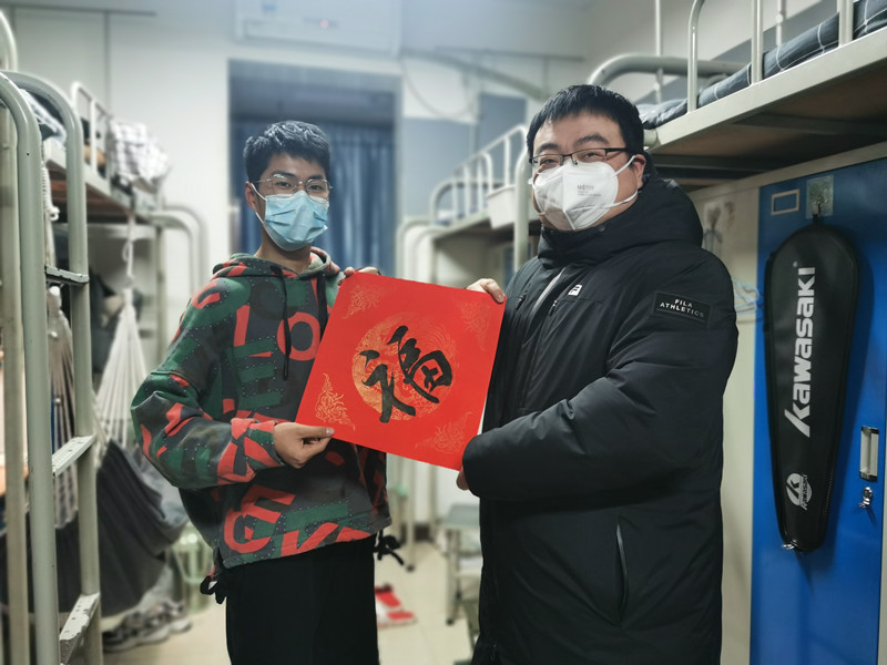 疫情防控期间,经济管理学院辅导员展现出良好的精神风貌。12月22日晚,封校一声令下,学生科科长闫应召迅速收拾行囊,住进学生公寓,和学生在一起,始终坚守在抗疫和学生管理一线。闫应召老师穿着防护服,积极参与核酸检测设备调试、扫码、身份查验等工作,闫老师看到在核酸检测排队中冷的瑟瑟发抖的学生,将自己身上备着的暖宝宝无偿的送给学生们。此外,闫老师从早到晚始终坚守在学生宿舍,做好宿舍管理、生活照料、防控宣传等工作,积极与心理波动的学生做好谈话疏导,确保分院1100多名学生的稳定和安全,始终做好经济管理学院学生管理的稳定器。12月31日晚,他还考虑到离家在外的学子有思乡之情,他深入到学生宿舍为学生们送去“福”字和对联,送上真挚的新年祝福。