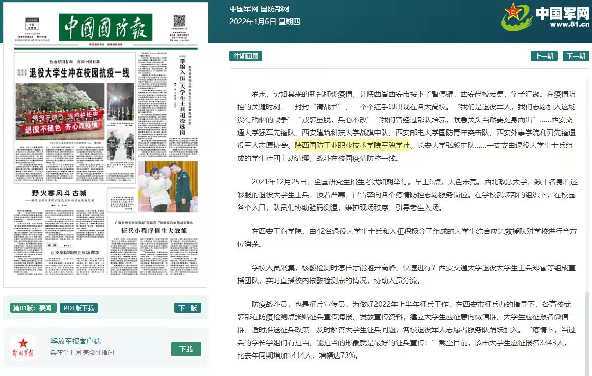 2022年1月6日(星期四)《中国国防报》头版报道我校退役军人先进事迹,展现我校学子抗疫风采。(原文链接http://www.81.cn/gfbmap/content/2022-01/06/content_306659.htm)