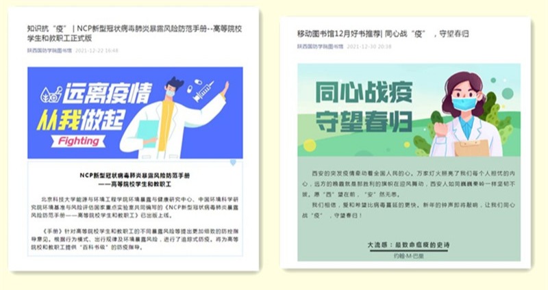 定期整理电子资源助力读者知识抗“疫”。为方便读者“宅”居期间充分利用图书馆的电子资源,我们定期推送了各类数字资源访问指南,为读者利用各类数据库提供了导引。同时积极整理了各类数据库资源,内容涉及中文电子图书、多媒体资源、中文学术论文数据库以及研学平台等类别,充分发挥图书馆文献资源保障作用,并通过微信公众号、门户网站及QQ群推送,助力学生知识抗“疫”。