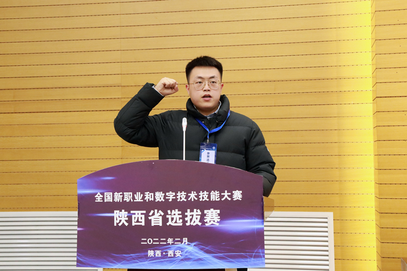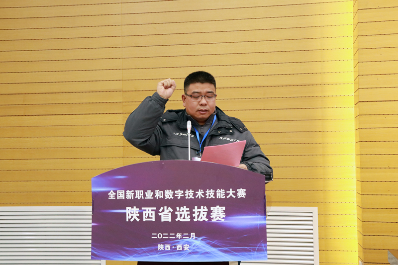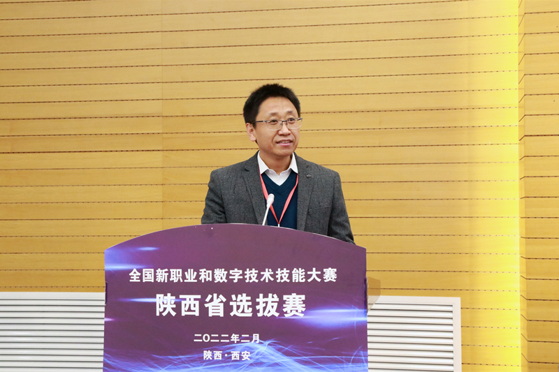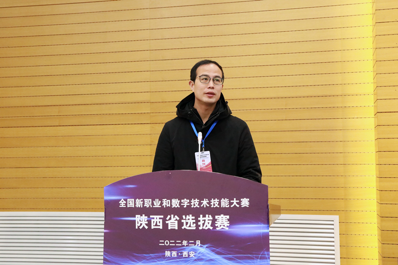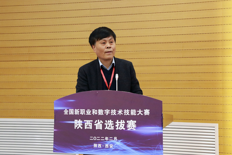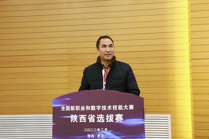 陕西省人社厅三级调研员苏根泰致开幕词并宣布大赛开幕。他在讲话中介绍了新职业的特点、背景和发展趋势,新职业和数字领域技术技能人才的重要性,并对学校前期筹备工作给予高度评价,他强调要始终把疫情防控作为“头等大事”,筑牢防疫底线,在竞赛的过程中,希望各位裁判员严格按照比赛和评分规则秉公办事,公平公正,希望各位参赛选手在比赛中发扬敬业、精益、专注、创新的“工匠精神”,赛出风格、赛出水平,冲出省赛、冲击国赛。