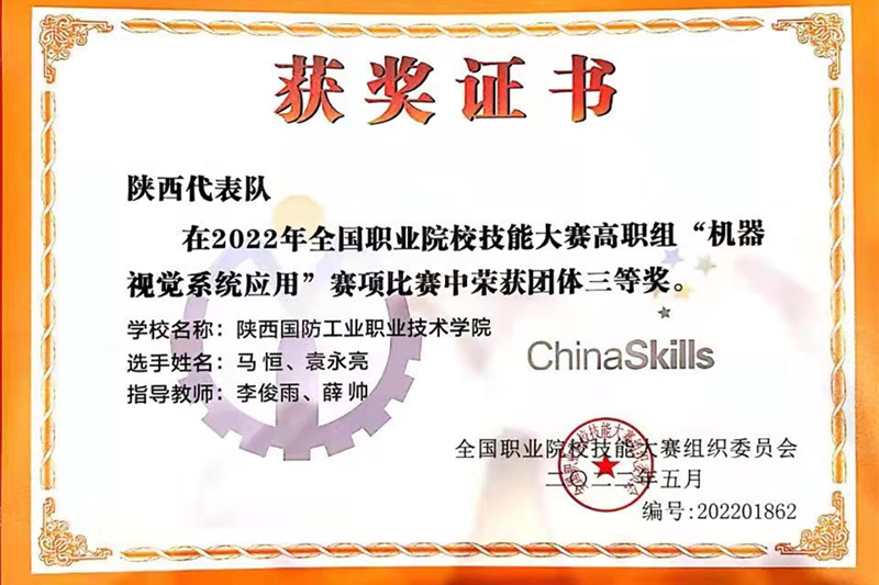 8月4日至7日,2022年全国职业院校技能大赛高职组“机器视觉系统应用”赛项在武汉光谷科技会展中心成功举办,来自全国29个省、自治区、直辖市的56支代表队参赛。我校由智能制造学院副院长沈博担任领队,李俊雨、薛帅老师指导的马恒、袁永亮两名学生代表陕西省参赛,经过激烈角逐,我校参赛队伍最终荣获团体三等奖。