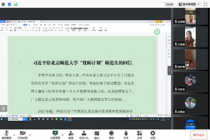 会议第一阶段,常继红带领全体教职工认真学习了习近平总书记在省部级主要领导干部“学习习近平总书记重要讲话精神,迎接党的二十大”专题研讨班上的重要讲话精神、习近平出席中央统战工作会议并发表重要讲话、习近平给“中国好人”李培生胡晓春回信、习近平给北京师范大学“优师计划”师范生的回信、《习近平谈治国理政》第四卷之紧抓“四个坚持”、网络安全宣传册等相关学习内容,并结合学习内容开展了讨论活动。