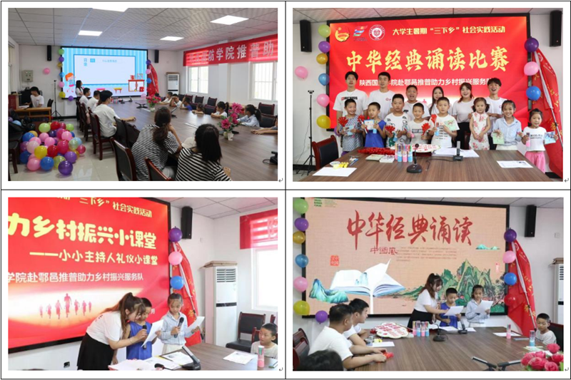 今年暑假,由校团委组建,李月娇、寇晓晶、王玉辉三位老师指导的“推普助力乡村振兴服务队”于7月10日—8月25日前往鄠邑区东马营村、鄠邑区麦张寨村以及团队成员自己的家乡,分别开展以“百年青春推普行,齐心协力助振兴”“传承经典启智润心,‘乡’约盛夏青春同行”“返家乡——推普助力乡村振兴”为主题的社会实践服务活动。