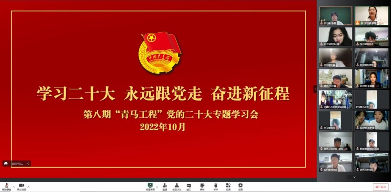 10月24日下午16:20,我校第八期青马班全体学员集体学习习近平总书记在中国共产党第二十次全国代表大会上的报告,并结合前期学习《习近平谈治国理政》第四卷的心得体会,学深悟透习近平新时代中国特色社会主义思想,立志做有理想、敢担当、能吃苦、肯奋斗的新时代好青年。