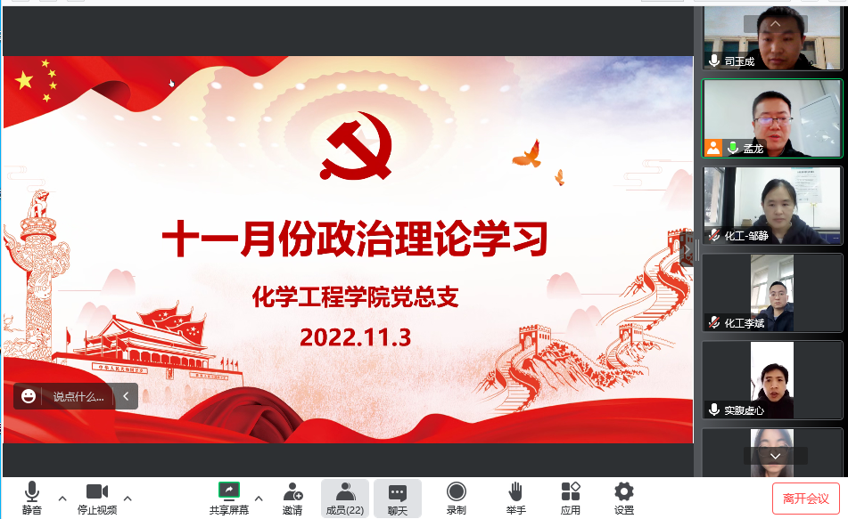 【化工学院党总支】2022年11月3日下午,化学工程学院党总支组织召开11月份教职工政治理论学习会,学习会采用线上腾讯会议的形式,会议由党总支书记孟龙主持。