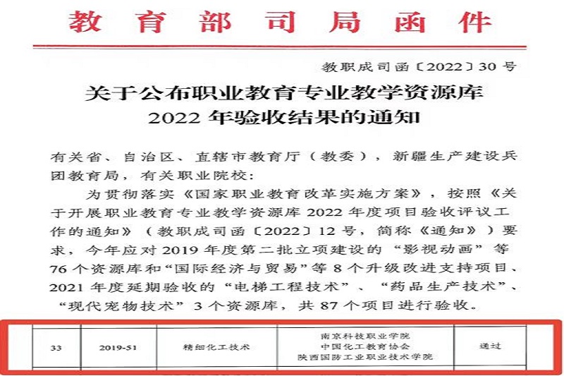 12月26日,教育部发布《关于公布职业教育专业教学资源库2022年验收结果的通知》〔教职成司函(2022)30号〕,我校与南京科技职业学院、中国化工教育协会联合主持建设的国家职业教育《精细化工技术专业教学资源库》项目顺利通过验收。