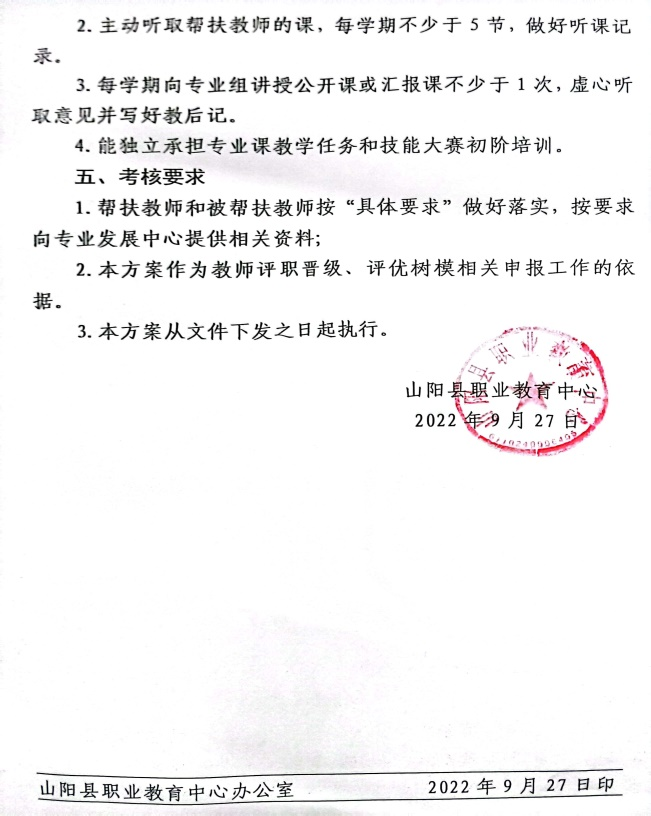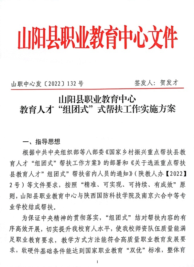 根据中共中央组织部等八部委《国家乡村振兴重点帮扶县教育人才“组团式”帮扶工作方案》的部署,我校与山阳县职业教育中心及南京六合中等专业学校开展了结对帮扶工作。