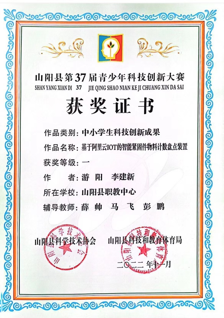 帮扶团队教师与其帮扶对象彭鹏老师,针对机械紧固件存储数量计数问题,共同指导学生设计制作《基于阿里云IOT智能紧固件物料计数盘点装置》,参加第37届中小学科技创新比赛,获山阳县一等奖,报送商洛市市赛。