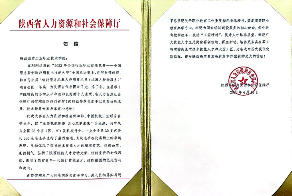 4月24日,陕西省人力资源和社会保障厅职业技能鉴定指导中心主任孟庆明、部长邓小峰莅临我校颁授贺信,表彰学校在全国服务型制造应用技术技能大赛代表陕西省取得的优异成绩,党委书记张卫平、校长刘敏涵、副校长孟繁增、获奖选手和教练、校企合作处、人工智能学院主要负责人参加了颁授贺信仪式,仪式由副校长孟繁增主持。
