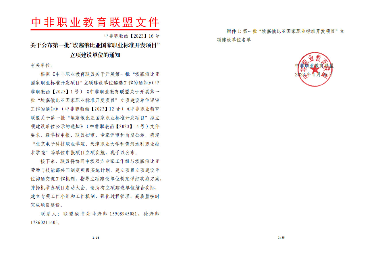 4月25日,根据中非职教联盟《关于公布第一批“埃塞俄比亚国家职业标准开发项目”立项建设单位遴选工作的通知》(中非职教函〔2023〕16号),经过前期申报、联盟初审、答辩评审,我校申报的机电系统技术员NTA4级职业标准顺利通过答辩,获批牵头建设单位。